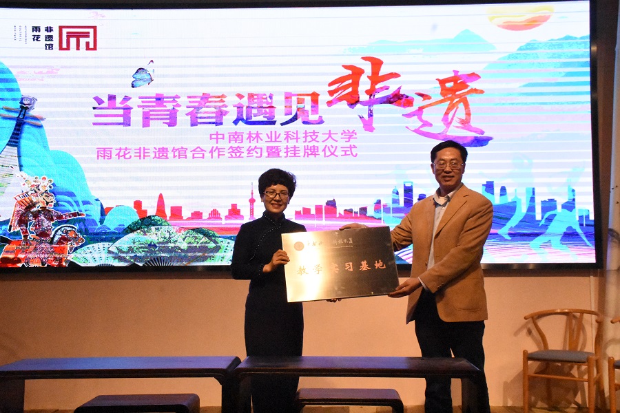 仪式上,雨花非遗馆馆长邓运姣和外国语学院党委书记李鹏飞分别致辞,表达了合作双方携手并进的美好愿望。副校长朱道弘发表了讲话,他指出,雨花非遗馆与我校的这次合作意义重大,将为我校师生提供更多学习了解我国丰富非遗文化的机会,同时也有助于弘扬中国传统文化,传承非遗记忆。致辞后,双方正式签订合作协议,雨花非遗馆被授予中南林业科技大学教学实习基地。