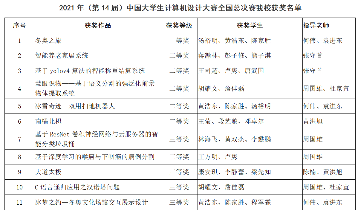 (文/计算机与信息工程学院 黄洪旭)“2021年(第14届)中国大学生计算机设计大赛”全国总决赛获奖名单近期揭晓。我校学子继去年之后再创佳绩,在本届大赛中荣获全国一等奖1项、二等奖5项、三等奖5项。而在早前的中南区域赛中,我校获得赛区一等奖9项、二等奖11项和三等奖6项。