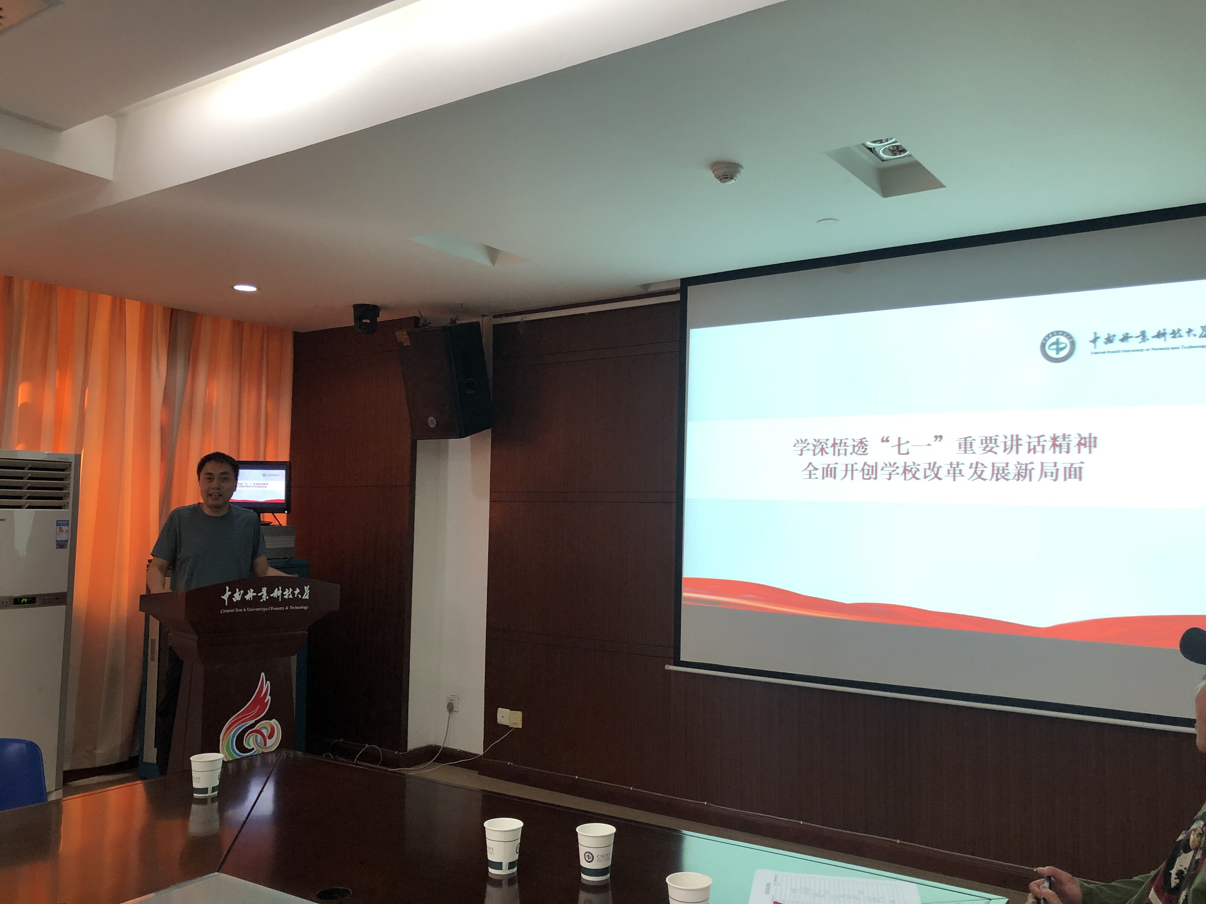 刘高强首先传达了第二十七次全国高校党的建设工作会议精神,并以辅导报告的形式,专题导学了习近平总书记“七一”重要讲话精神和关于加强高校党建工作的重要论述、《中国共产党普通高等学校基层组织工作条例》。