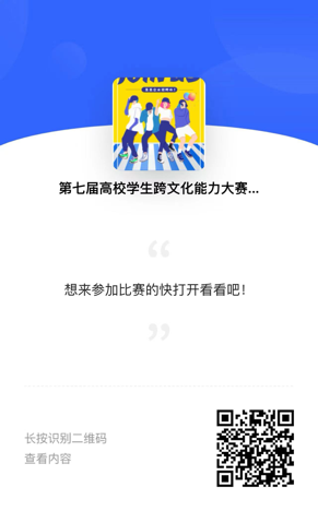 预赛形式:按要求将个人作品(3分钟的英语自我介绍,包括对跨文化交际的个人理解陈述录成视频)发送到指定邮箱。