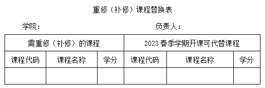 替代课程重修安排 如学生在选课过程中找不到需要重修的课程,表示2023春季学期未开该课程,或开设的课程与需要重修(补修)课程的课程代码不同,此时学生可在“附件3.2023春季学期教学任务”中查找类似课程,并填写“重修(补修)课程替换表”进行课程替换,替换后方可选课。“重修(补修)课程替换表”由学院收集整理后,在报名选课缴费时间段内,由学院统一提交给教务科(不接收学生个人申请)。